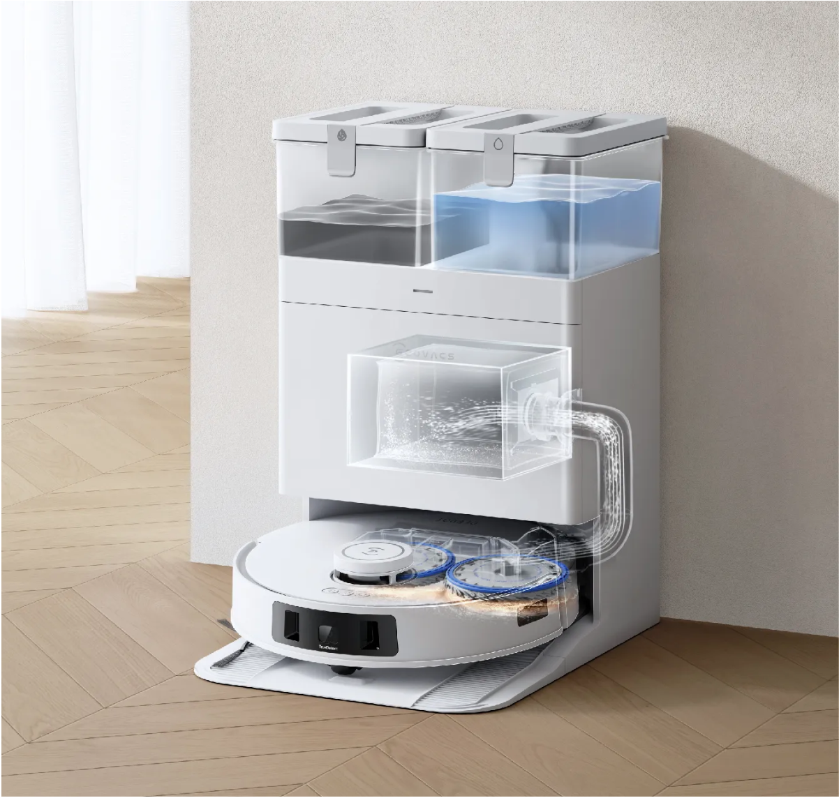 Visaptveroša uzlādes bāze ar automātisku iztukšošanu, karsto gaidu žāvēšanu (45 °C), automātisku mazgāšanu un mop bļodiņas pildīšanu.